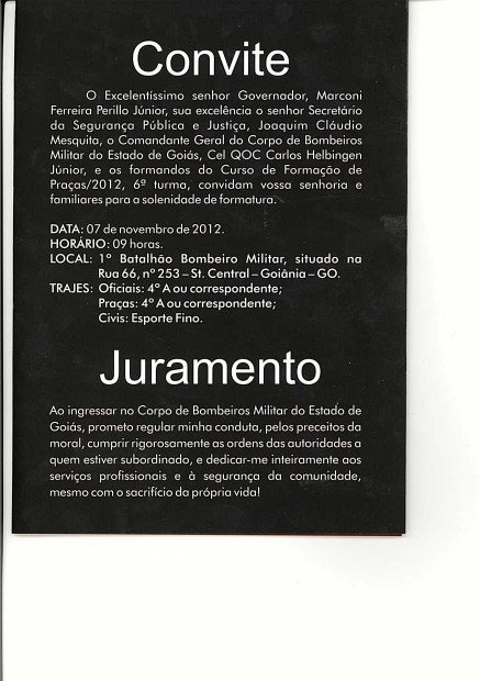 O Comandante Geral do Corpo de Bombeiros Militar do Estado de Goiás, Coronel Carlos Helbingen Júnior, convida para solenidade de formatura do Curso de Formação de Praças (CFP), nesta quarta-feira, dia 7. A cerimônia será no pátio do 1º Batalhão Bombeiro Militar, às 9 horas.