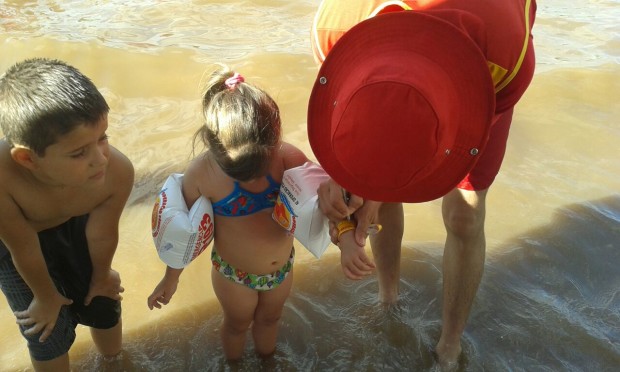Crianças recebem boias de braço e pulseiras de identificação da Operação Férias Turista Seguro