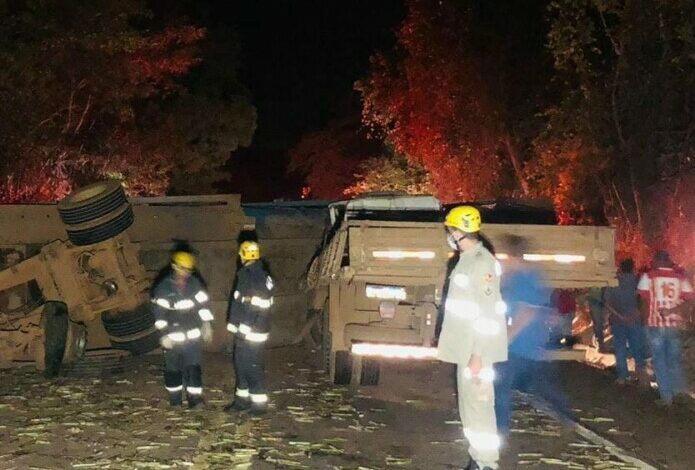 A equipe de serviço do Corpo de Bombeiros Militar em Trindade foi acionada para atender a um grave acidente de trânsito no km 11 da GO-326, no município de Nazário, na madrugada desta quarta-feira, 15. No local, encontraram um caminhão bitrem tombado obstruindo a via e um segundo veículo, um carro caminhão, colidido, com o motorista preso nas ferragens. Houve uma colisão frontal entre eles. A equipe do SAMU já estava no local e confirmou a ausência de sinais vitais da vítima, aguardando a chegada do IML para os procedimentos necessários. Após a liberação do corpo, a equipe dos Bombeiros, junto com a Polícia Técnica Científica, iniciou o processo de desencarceramento utilizando tratores. O corpo foi deixado aos cuidados do IML. O motorista do bitrem não se feriu.