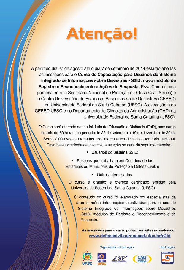 O Curso será oferecido na Modalidade de Educação a Distância (EAD), com carga horária de 60 horas, no período de 22 de setembro a 19 de dezembro de 2014. As inscrições podem ser realizadas no site: http://www.defesacivil.cursoscad.ufsc.br/