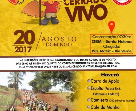 Interessados em participar da Pedalada Cerrado Vivo, promovida pelo Corpo de Bombeiros Militar do Estado de Goiás (CBMGO), têm até o dia 15 de agosto para fazer sua inscrição. A ação vai promover um passeio ciclístico entre as cidades de Santa Helena de Goiás e Rio Verde no domingo, dia 20 de agosto. As inscrições são gratuitas e podem ser feitas no quartel do CBMGO em Santa Helena de Goiás, pelo e-mail cbmgo.santahelena@gmail.com e até mesmo pelo WhatApp no número (64) 99224-4108. Os 200 primeiros inscritos vão ganhar uma camiseta do passeio de cerca de 30 quilômetros que tem como objetivo chamar a atenção da população para a preservação do Cerrado e a importância de se evitar queimadas. O trabalho da Operação Cerrado Vivo 2017 tem como objetivo prevenir e combater focos de incêndios em vegetação. Neste período de estiagem e baixa umidade relativa do ar, a ação dos bombeiros é intensificada em todo estado.