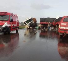 Caminhão x caminhão. Durante a ocorrência foi estabelecida a segurança do local e estabilização do cenário. Óbito no local de um dos condutores do caminhão, sexo Masculino, 26 anos. O outro condutor de 60 anos, não apresentou lesões e foi avaliado no local.