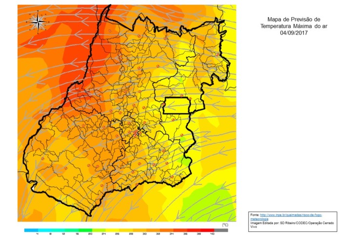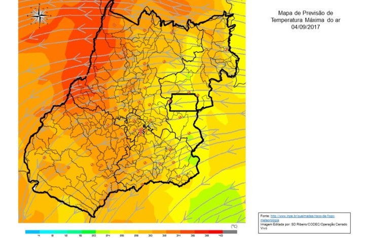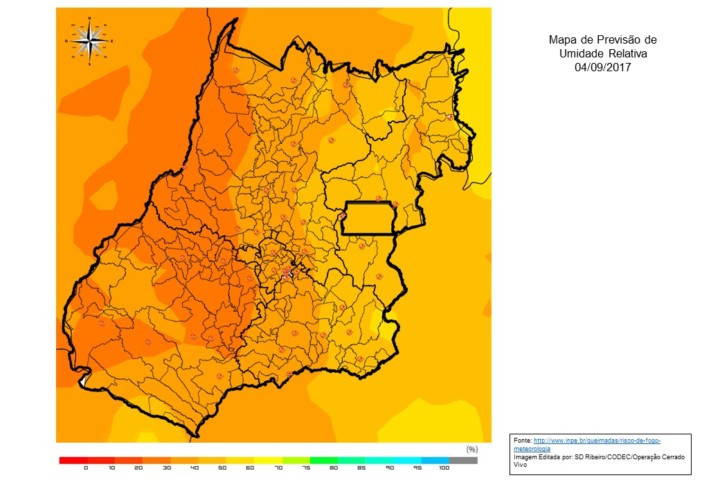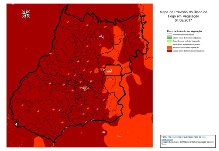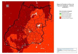 Estamos em um momento crítico, as altas temperaturas, a baixa umidade relativa do ar e longo período sem chuvas colocam o Estado de Goiás no nível mais elevado do prognóstico de risco de fogo, conforme demonstram os mapas elaborados pela corporação com base nos dados emitidos pelo Instituto Nacional de Pesquisas Espaciais (INPE).