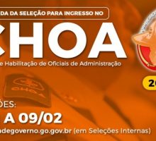 O Comando Geral do Corpo de Bombeiros Militar do Estado de Goiás informa a retomada da seleção para ingresso no Curso de Habilitação de Oficiais de Administração – CHOA 2021. O processo seletivo será realizado pela Escola de Governo e serão disponibilizadas 20 vagas. As inscrições já se encontram abertas e vão até o dia 09/02/21, podendo ser feitas através endereço www.escoladegoverno.go.gov.br.
