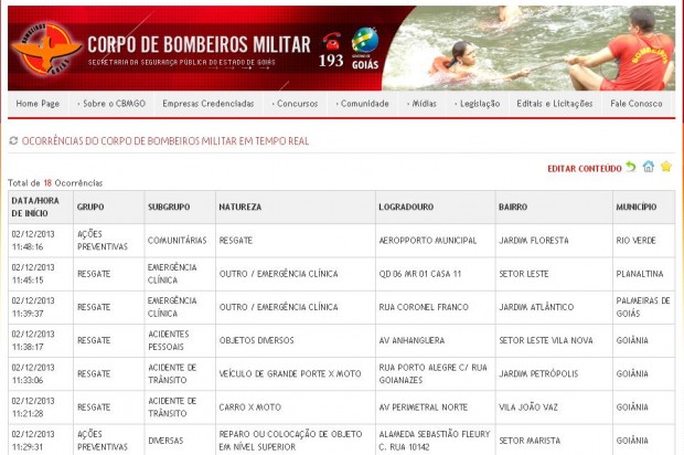 O Corpo de Bombeiros Militar do Estado de Goiás (CBMGO), através da Seção de Informática e Telecomunicações – BM/6, realizou na manhã de segunda-feira, dia 2, o lançamento oficial da nova funcionalidade no site da Corporação denominada Ocorrências em Tempo Real (www.bombeiros.go.gov.br/ocorrencias).