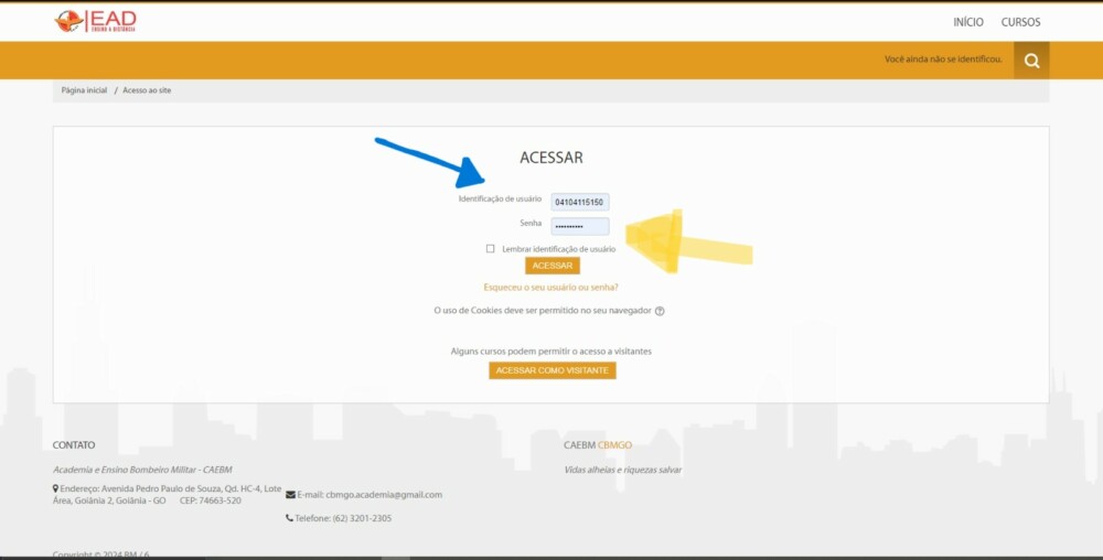 Caso seja o seu primeiro acesso á plataforma, basta inserir seu CPF no campo “Identificação de usuário” e no campo “Senha” inserir: @Cbmgo193 e em seguida alterar para a senha desejada de sua conta na plataforma EAD.
