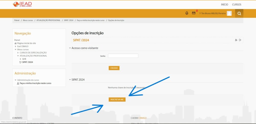 Para realizar a inscrição, basta clicar no botão “Inscreva-me”, sinalizado pelas setas azuis na imagem.