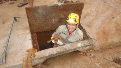 Bombeiros Militares de Santa Helena de Goiás resgatam filhote de cachorro preso em bueiro